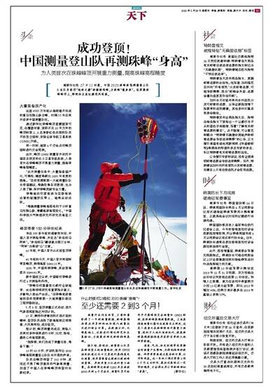 [据新华社电 27日11时整,中国2020珠峰高程测量登山队8名队员登顶“地球之巅”珠穆朗玛峰,为珠峰“量身高”。世界最高峰峰顶上,鲜艳的五星红旗迎风招展。]