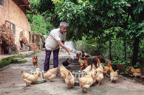 ■在驻村工作队帮扶下,贫困户余金宏除了种稻,还养鸡增加收入。 |