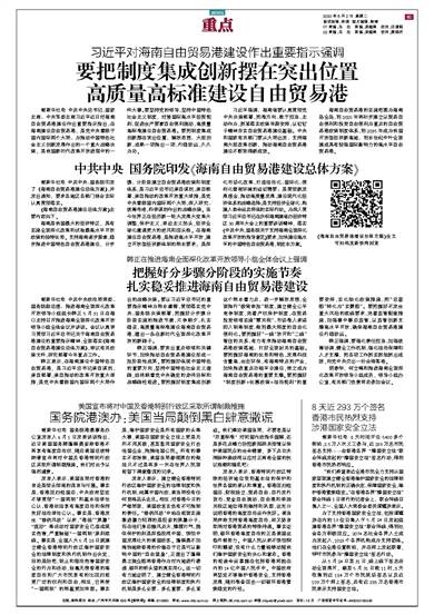 据新华社电 中共中央、国务院印发了《海南自由贸易港建设总体方案》,并发出通知,要求各地区各部门结合实际认真贯彻落实。