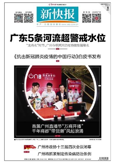 广东5条河流超警戒水位 “龙舟水”时节,广州今明两天仍有持续性强降水 12 《抗击新冠肺炎疫情的中国行动》白皮书发布 02 首届广州直播节“万商开播” 千年商都“带