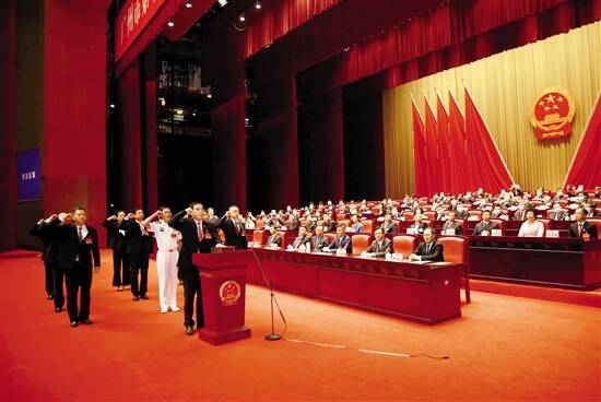 ■会议主席团组织新当选的广州市第十五届人大常委会主任石奇珠等10人进行宪法宣誓。 |