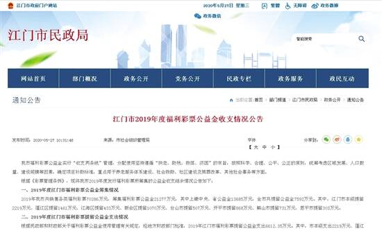 2019年筹集公益金2.12亿元 2019年江门市福利彩票发行中心坚持以人民为中心,以高度的社会责任感和使命感来推动福利彩票工作,紧扣业务主线,加强规范管理,抓重点、破难点、聚亮点,提质发展,共销售各类福利彩票70286万元,筹集福利彩票公益金21277万元,其中上缴中央、省公益金13685万元,全市共提留公益金7592万元。其中,江门市本级提留2219万元、蓬江区提留1461万元、江海区提留433万元、新会区提留1070万元、台山市提留507万元、开平市提留868万元、鹤山市提留731万元、恩平市提留303万元。 90个项目共计支出6612万元 根据民政部和财政部关于福利彩票公益金使用管理有关规定,经地方财政部门批准,2019年江门市福利彩票提留公益金分配使用,坚持遵循“扶老、助残、救孤、济困”的发行宗旨,按照科学、合理、公平、公正的原则,统筹考虑区域发展、人口数量、建设规模等因素,确定项目补助标准,重点用于养老服务体系建设、社会救助、社区建设及殡葬改革、其他社会事务等四大方面共90个项目,支出合共6612.35万元。其中,市本级支出2219万元、蓬江区支出1461万元、江海区支出433万元、新会区支出777.5万元、台山市支出378.63万元、开平市支出462.72万元、鹤山市支出590.5万元、恩平市支出290万元。2019年度江门市福利彩票公益金共结余979.65万元。其中新会区结余292.5万元、台山市结余128.37万元、开平市结余405.28万元、鹤山市结余140.5万元、恩平市结余13万元。 福彩投注站将同步张贴海报 江门市福彩中心每年都按序时进度印制海报,张贴在全市的投注站内,把上一年度本市福彩公益金“收支两条线”的详细情况展现给彩民,主动回应彩民关切,增添对“阳光福彩”的信心。接下来,全市投注站将同步张贴2019年度福彩公益金收支情况公告海报,彩民在购买彩票同时,可以阅览了解福彩公益金对市本级和三区四市的详细项目支出和全市社会福利与慈善事业发展取得的成果。