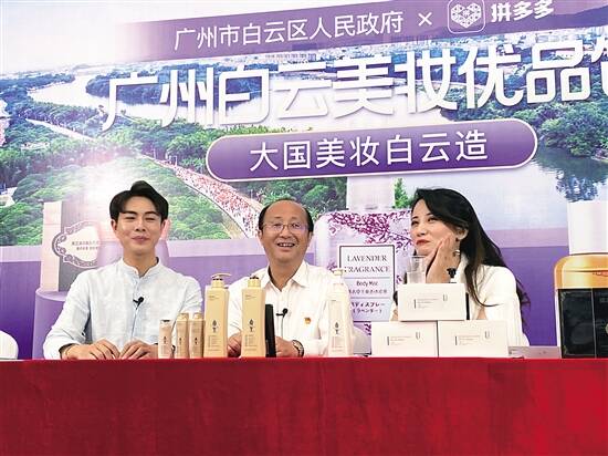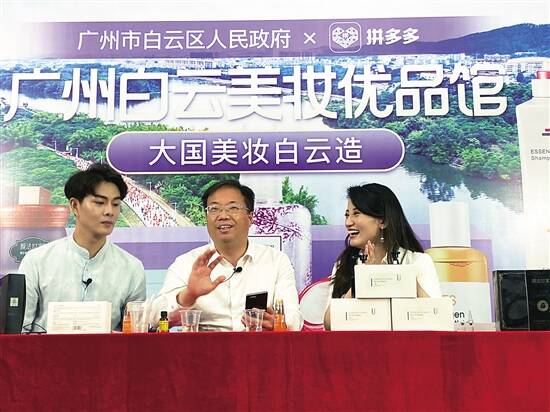 ■广州市白云区副区长蔡胜在拼多多美妆馆直播间,为网友介绍白云美妆品牌,并发放优惠福利。(摄影/石头) |