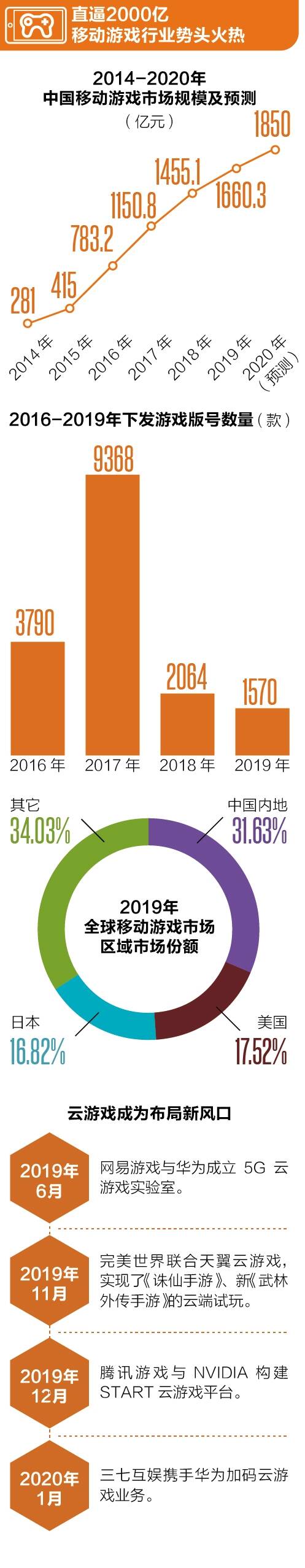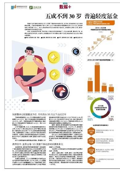 然而,在游戏版号政策、内容总控、市场竞争等因素倒逼下,行业加速洗牌,精品化产品、品牌化运营成为常态化,未成年人的健康成长引导问题成为重中之重,移动游戏行业生态正面临全新挑战。 ■策划:新快报记者 罗韵 ■统筹:新快报记者 梁彧 ■采写:新快报记者 张磊 ■制图:廖木兴 玩家整体以轻度氪金为主 月均流水50元以下占比过半 艾媒咨询数据显示,2019 年中国移动游戏行业市场规模为1660.3亿元,预计今年移动游戏市场规模将达到1850亿元。此外,我国移动游戏用户规模发展进入稳定期,2019年移动游戏用户规模达到5.86亿人,预计2020年将超过6亿人。 从用户画像来看,90后、95后玩家是移动游戏的主力军,30岁以下人群占到五成左右;在用户属性方面,重度、中度玩家总占比达到了44.5%;在移动游戏获取渠道方面,艾媒数据显示,半数以上受访用户通过朋友获知手游资讯,玩家线上资讯获取渠道呈现多元化的特征,除社交平台外,垂直游戏类、视频、直播及内容平台也位列其中。 此外,玩家普遍存在游戏氪金的现象。数据显示,在移动游戏的花费月均流水在50元以下的占比53.4%,花费100-1000元区间的用户占比近三成,也有少数玩家月均移动游戏花费在1000元以上。艾媒咨询分析师认为,当前移动游戏玩家整体以轻度氪金为主。 值得一提的是,国内移动游戏行业的迅猛发展与国家层面版号的逐步恢复联系紧密。2018年12月,游戏版号发放恢复;2019年,共计1570款游戏过审(含185个进口游戏版号)。严审批制度倒逼行业加速升级,生产环节从粗放式发展向精细化转变,游戏品质也有一定程度的提升。 此外,在5G商用加速落地的背景下,云游戏也正在成为多方厂商拓展增量市场的重要赛道。中国云计算服务商、游戏开发商、网络运营商等多方正在加速布局云游戏项目。 跨界合作、业务出海 5G浪潮下移动游戏场景更多元 在政策收紧、竞争激烈等多重因素刺激下,移动游戏厂商加速破圈,积极寻找海外机会,并且加快跨界合作步伐。以《大话西游》为案例,品牌、公益营销动作不断,还携手小肥羊开主题店;《阴阳师》携手它基金等开展关爱流浪动物公益行动;《超能球球》手游先后与周黑鸭、TT语音、饿了么进行跨界合作。 在游戏出海领域,以三七互娱和腾讯为代表的企业在产品和资本层面布局不断。2019年上半年,三七互娱海外品牌37GAMES连续覆盖超过200个国家和地区,发行全球手机游戏100款;腾讯接连投资海外工作室,积极招纳海外人才和创意。 与此同时,以年轻玩家为主导的移动游戏行业场景正在进一步拓展。 游戏+直播、游戏+视频、游戏+音乐等各种新形式层出不穷。在游戏直播细分领域,艾媒咨询调研数据显示,两成左右玩家每日观看游戏直播,并参与互动、打赏。艾媒咨询分析师认为,5G浪潮下,围绕游戏展开的泛娱乐场景也将进一步开拓。游戏与其他载体的融合也更紧密,围绕游戏展开的泛娱乐场景也将进一步开拓。