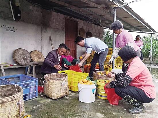 ■黄荣炎(左三)在帮着村民一起打包沃柑。 |