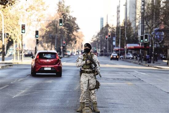 ■智利陆军特种部队的士兵在圣地亚哥街头维持秩序。新华社发 |