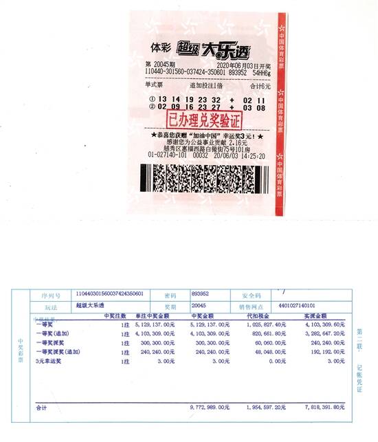 中奖站点曾中出3200万巨奖 6月3日,体彩大乐透迎来派奖活动以来的第16期开奖,第20045期全国中出一等奖56注,其中37注是追加投注命中。广东中出的977万追加头奖,落在广州市惠福西路白微街的4401027140体彩实体店,该店曾经在2017年中出过3200万元大乐透巨奖,并一度刷新过当时的广州体彩大奖纪录。 第20045期的中奖彩票是一张6元2注号码追加投注票,其中1注号码中得追加头奖923万多元和派奖奖金54万多元,总计977万多元。当时就引起了议论,猜测这2注追加投注票其实是中奖人购买了其他彩票,达到了“广东体彩大乐透2200万元赠票惊喜大回馈”的赠票条件所获得的机选赠票奖励。 赠票除中头奖还中3元幸运奖 果然不出所料,6月15日,随着老孟兑奖,这个猜测也被证实。老孟说,自己一直都是大乐透的粉丝:“从上市的第一期就一直买,到现在了。”他还说,每一期都不会落下,多少都买一点,单复式都会有,而且会倍投,所以这张中奖彩票完全不是自己的风格:“这2注其实是买了另一注追加再投50倍,花了150块钱,彩票店说满60再送我两注单式追加,是这么来的。我自己买不可能只买1倍的。”老孟说,只可惜自己买的50倍没有中,不过这次赠票却是运气爆棚,不只中了追加头奖,还中了3元的幸运奖。“也就是说这张不光不花钱,也不光挣了个大奖,还连3元幸运奖都不放过,哈哈!” 与3200万中奖者是生意同行 老孟的女儿也透露,爸爸天生对数字很敏感,记忆力很好,彩运也不错:“他每周都会中点小奖,几块几百块的样子。每年大概会中5-8次几千到一万的奖,之前最厉害那次中过大乐透的三等奖呢。”这时,工作人员便问:“那中过这么多次奖,应该会相信的确有人中头奖的吧?”老孟的儿子马上接过话,说:“当然相信啊,就这个彩票店两年前中3200万元,中奖的叔叔跟我们家是生意上的同行呢,都认识的。” 老孟得知自己中奖后,并没有像大多数中奖人那样兴奋激动、彻夜难眠,相反,他一直心情都很平静:“我来广州这么多年都在做鞋帽生意,大风大浪大起大落都经历过了,900多万是不少,但也不算太多,尤其在大城市,有两套房资产都过千万了,所以也不至于睡不着。当然咯,有了这笔钱,我周转上会更灵活些,生意上的安全垫更厚实些,那是肯定的。”