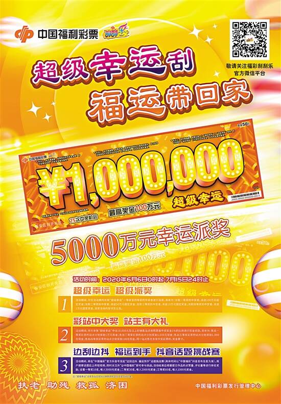 6月6日至7月15日,连续40日中福彩中心开展“超级幸运”即开型彩票5000万元派奖活动。活动期间,对兑取“超级幸运”一等奖至四等奖的中奖者进行派奖,一等奖中奖派送100万元固定奖金,二等奖中奖派送50万元固定奖金,三等奖中奖派送10万元固定奖金,四等奖派送1万元固定奖金。 活动二: 刮刮乐中1000元送1000元 6月16日开始,广东省福彩中心开展“福彩刮刮乐幸运有约”赠票活动,购买广东省刮刮乐即开票单张彩票中得1000元奖级且在开展活动期间兑奖即赠送一本价值1000元“超级幸运”即开票或者两本“新春大吉”即开票(每本500元,两本共1000元)。 活动三:双色球“你中奖我买单” 从双色球第2020052期(开奖日期2020年6月18日)开始,在广东省内购买且是以14元的“7+1”、28元的“7+2”、112元的“8+2”、168元的“9+1”或420元的“10+1”这五种复式购买双色球又中奖的,兑奖时返还中奖票投注金额相等购彩金。 赠票金金额达到2500万元当期双色球游戏期结束后停止。
