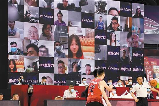 ■赛事主办方通过赛场布置、网上直播、球迷互动等形式营造出线上线下“热烈”的观赛氛围。这是5G云观众在广东东莞银行篮球中心的大屏幕上通过直播观看场内比赛(6月20日摄)。新华社发 |