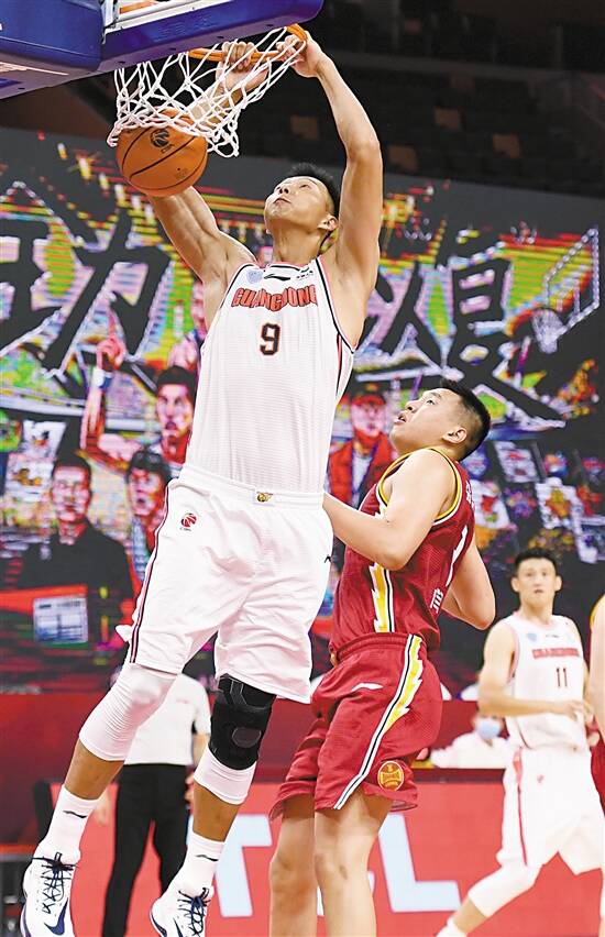 ■6月20日,广东东莞银行队球员易建联(左)在比赛中扣篮。 新华社发 |