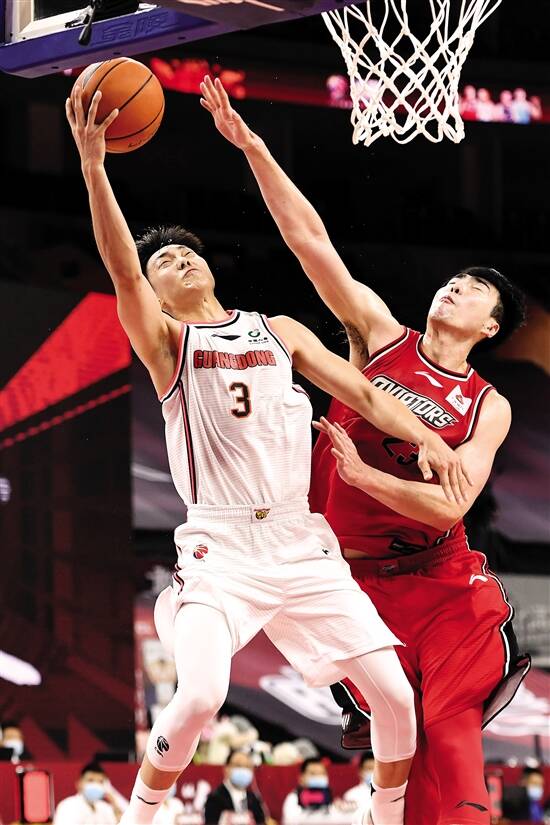 ■6月22日,广东东莞银行队球员胡明轩(左)在比赛中上篮。 |