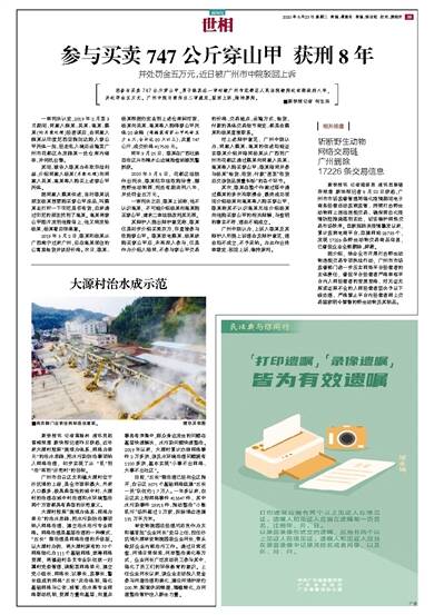 ■新快报记者 何生廷 因参与买卖747公斤穿山甲,男子陈某在一审时被广州市花都区人民法院被判处有期徒刑八年,并处罚金五万元。广州中院日前作出二审裁定,驳回上诉,维持原判。 一审判决认定,2