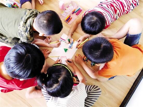 ■在阳江市三甲镇中心小学三甲圩分校的多功能教室,孩子们围在一起上美术课。 |