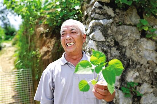 ■贫困户黎志才如今已成了养鸡专家。如果鸡感冒了,他会用野生山麻叶来喂它们,据说效果很好。 |