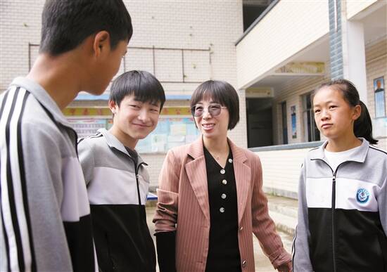 ■威宁县保家中学,来自番禺区南村中学的教师周丹,课间询问学生们的学习情况。 |