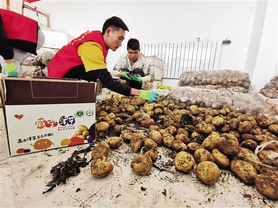 ■威宁益民电子商务有限公司仓库,工作人员正在分拣土豆,经过包装将发往全国各地。 |