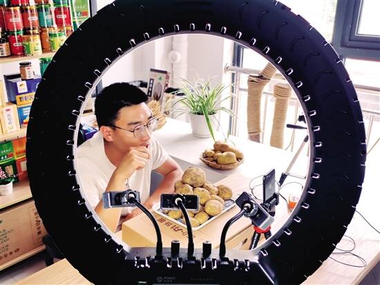 ■威宁益民电子商务有限公司,一位年轻小伙子正在做直播,向网友介绍威宁特色农产品:土豆。 |