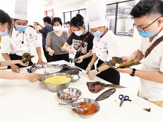 “台山扭角粽以前是用整个熟的咸鸭蛋来做,但粽子煮好放久后,蛋白会变得很硬,口感不佳,因此后来就改良用生的咸蛋黄。”在粤粽制作互动环节中,点心大师现场指导教学。