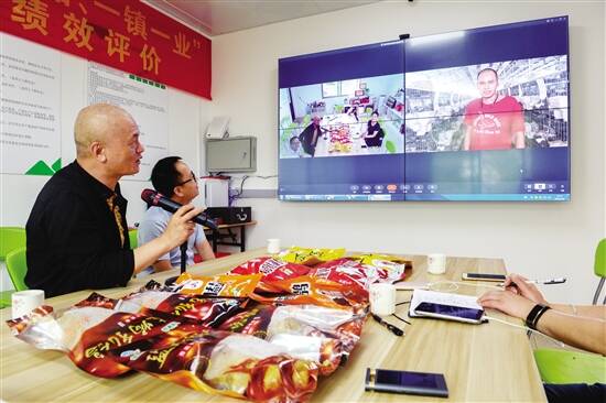 ■在碧园村办公室,广州市驻兴宁市扶贫工作组组长蓝蓝通过一套数字农业监控调度平台,与包括钟会权在内的各基地工作人员视频连线。 |