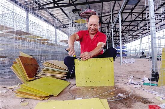 ■贫困户王龙辉年后来到养鸽场工作,现在已是制作鸽笼配件的好手。 |
