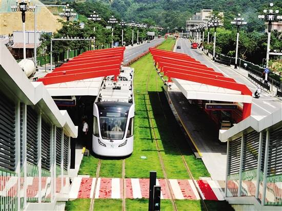 ■7月1日,广州黄埔有轨电车1号线示范段(地铁长平站—永和新丰站)提前开通!此次开通试运营的示范段长约7公里,设10站9区间。全线14.4公里预计今年底开通。新快报记者 李小萌/摄 |