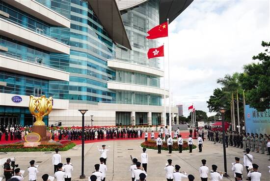 ■7月1日清晨,香港金紫荆广场,伴随嘹亮的国歌声,鲜艳的五星红旗和香港特别行政区区旗一同升起,香港特别行政区迎来第23个回归纪念日。 新华社发 |