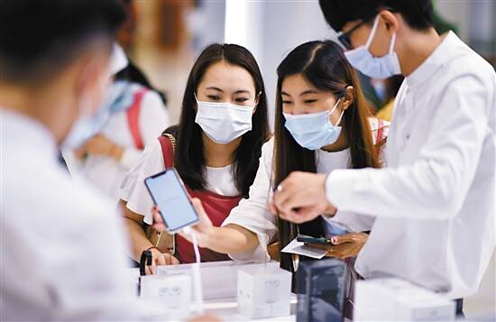 7月1日,顾客在海口日月广场免税店选购手机等电子消费产品。 当日,海南开始实施调整后的离岛免税购物政策。海南离岛旅客每年每人免税购物额度提高至10万元,电子消费产品等7类新增商品开售。 新华社发