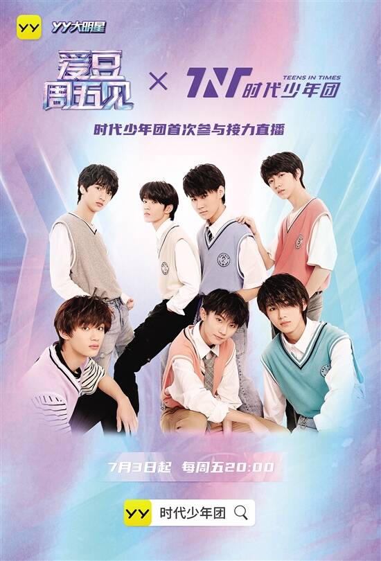 时代少年团由马嘉祺、丁程鑫、宋亚轩、刘耀文、张真源、严浩翔、贺峻霖7位00后少年组成。组合于2019年11月出道,是知名青春偶像男团TFBOYS的“师弟团”。出道后,时代少年团即亮相湖南卫视2020跨年演唱会,并获“年度潜力组合”“年度新声代团体奖”等荣誉,人气迅速飙升。 《爱豆周五见》在YY直播每周五晚开播,粉丝可以和明星在固定时间进行互动交流,明星则通过接力直播,向粉丝传递快乐和正能量。