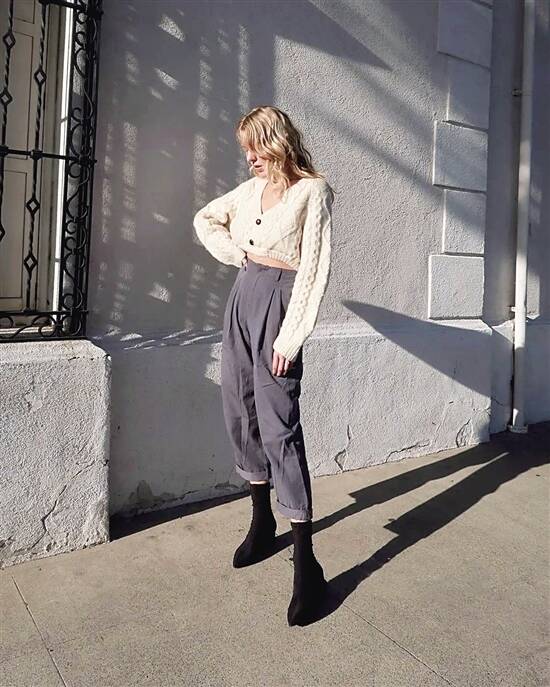 ▲上半身穿得够清凉,下装就要搭配宽松中性的裤子来中和一下,除了阔腿裤,高腰锥形裤也是不错选择,八分长度更显腿长。 |