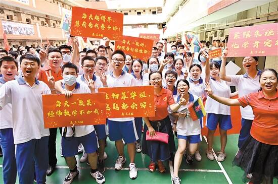 ■昨日上午,广大附中大学城校区3000多名师生员工齐聚校道两旁,为高三学生举行隆重的高考壮行仪式。新快报记者 夏世焱/摄