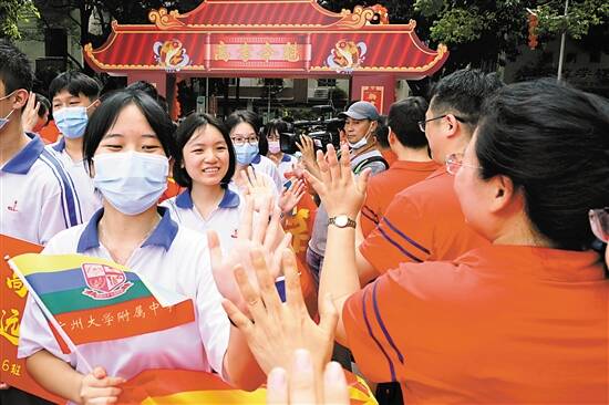 ●广州大学附属中学 舞狮击鼓过龙门 逾3000师生送祝福 7月6日,广大附中大学城校区举行高考壮行仪式,3000多名师生员工齐聚校道两旁,给即将踏入高考考场的考生们送去祝福和力量。 雄狮舞鼓声响,老师们也在今天纷纷换上红装给孩子们打气。在激昂的音乐声中,广大附中校长欧卫国、党委书记何晓晴带领全体高三师生再走一次熟悉的校园,学生们沿着校道依次走过食堂、行政楼、教学楼、信息楼、操场,迎着仲夏的阳光,迈着矫健的步伐,以豪迈、激情、昂扬的姿态走在校道上。“高三加油,广附必胜!” 校道旁的学弟学妹们喊出响亮的口号,为考生们加油。 高三(5)班潘同学拿着“考入双鸭山,天天西稻米!”的标语走在队伍内,他解释“双鸭山”指的是中山大学,他的目标学校,“西稻米”则是那附近好吃的外卖店名。“跟着大家一起喊口号的这种方式很释放压力。”声音已经略显沙哑的他精神抖擞。 在队伍的最后,国防班的学生穿上军装,以挺拔的身姿、标准的军礼向全体高三学生致以最诚挚的祝福。最后考生们穿过“龙门”,与校领导和高三全体老师击掌、拥抱。 ●华南师范大学附属中学 喊楼第十年 依旧惊喜和感动 “状元桥、才俊行、仗剑三载铸豪情;波澜动、风云定、笔落他日惊天地。”6月18日,距离高考19天,一百多名华附高一的蓝白衣“少侠”们,以学校聚清园的状元桥为中心,围成三圈,喊着口号为即将踏上高考考场的师兄师姐们壮行。 学生们采用击鼓的方式,整个队伍发声整齐划一,气势如虹。接着同学们播放了去年已经毕业的学生自发拍摄的短片,“要坚持”“年少共轻狂,谈笑倚同窗”……影片内,校友的声声祝福给即将踏上考场的考生们带去力量。 记者了解到,在正式喊楼的前一周,华附高一每班十名同学自主报名,在聚清园内踩点彩排,并到体育馆练习喊口号。据说,整个排练过程都瞒着高三学生,只为在最后关头给到他们带去惊喜。 据悉,今年是华附“喊楼助威”的第十年。从2011年开始,每年的初三中考、高三高考、高二水平测前,华附学生都会为自发举行“喊楼助威”活动。 ●广州市第四中学 校园变喜庆 考生暖心头 高考前夕,四中校园内的高楼增添了一份“喜庆”。多条红底黄字的竖幅标语,从楼的最高层一直延伸到了楼底。“只争朝夕”“不负韶华”“十载寒窗莘莘学子俊采星驰今朝蟾宫折桂喜题金榜”“百年四中泱泱家园宏图志展明日苍穹揽月乐育栋梁……衬托得校园一派热闹和喜庆,以此给高考生们带去鼓励。此外,高一、高二24个班的学生还会分别拟一条祝福语送给高三考生。