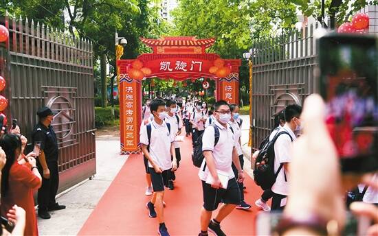 ■高考首日,广州天河中学考点,考生们有序进入考场,并与老师们击掌加油。 |