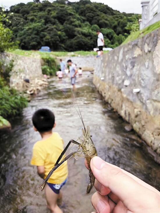■大源支流清澈见底,市民带孩子到溪边戏水捉虾。 |