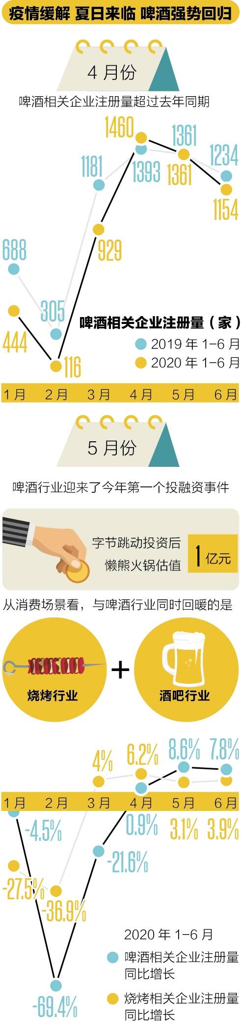 随着啤酒业加速行业整合与升级,啤酒品类也在发生改变。继华润啤酒、青岛啤酒和百威啤酒之后,6月底嘉士伯啤酒也完成了资产整合。高端啤酒市场成为整合后啤酒企业的重点发力方向。精酿、原浆桶啤、黑啤、白啤等的中高端啤酒产品逐渐成为企业业务主线,更精致的啤酒也丰富着人们的餐桌。 ■策划:新快报记者 罗韵 ■统筹:新快报记者 罗韵 ■采写:新快报记者 郑栩彤 ■制图:廖木兴 啤酒消费强势反弹 5月啤酒产量同比增14.6% 随着国内疫情好转,4月起啤酒消费行业迎来强势反弹。据天眼查数据,由于疫情影响,今年一季度国内新注册啤酒相关企业1487家,同比下降超三成。但今年4月,国内新注册啤酒相关企业数量达到1460家,同比增加67家。啤酒消费也在回暖。据国家统计局数据,今年4月、5月国内规模以上啤酒企业的产量分别同比增长7.5%和14.6%。国开证券表示,国内疫情逐渐平稳后,家庭小聚恢复更快速,带动啤酒消费。“地摊经济”也有效增加消费场景,提升了消费者信心。此外,今年4月以来,国内多地高温天气较多,也使啤酒旺季销售特征显现。 据新快报记者统计,与啤酒消费同时回暖的,是其主要消费场景酒吧和烧烤行业。今年一季度,全国新注册酒吧2481家, 同比下滑25%。1-2月份,烧烤相关企业注册量则为4448家,同比大降31%。但自3月起,烧烤相关企业注册量便开始回暖。4月,酒吧企业注册量也开始反超去年同期。 夏季啤酒消费也显著提振了啤酒厂商的业绩。受疫情影响,今年一季度青岛啤酒、珠江啤酒、重庆啤酒和燕京啤酒净利润下滑33.48%、31.06%、60.2%和518%。但自4月起,啤酒销量便强势反弹。珠江啤酒接受投资者调研时表示,其4、5月份销量分别增长近10%和6%。4月份,青岛啤酒销量维持双位数增长,5月份增长态势良好。据悉,华润啤酒4、5月份整体经营状况也逐渐好于去年同期。而据珠江啤酒近日发布的半年报预告,今年上半年珠江啤酒预计盈利2.33亿元-2.75亿元,同比大增10%-30%。 相关股票价格也水涨船高。7月13日,青岛啤酒股价涨至80.85元/股的上市以来新高,珠江啤酒也以10.69元/股的股价创下年内最高。4月1日至7月13日,A股重庆啤酒、燕京啤酒和港股华润啤酒股价分别累计上涨62.1%、23.7%和35.1%。 夏日消暑佳品来一杯?喝的也是情怀 炎炎夏日,来一杯当地品牌的啤酒成为夜间消费的一种情趣。而若到不同的地方旅行,喝喝当地品牌的啤酒也是一种不错的选择。即便近年来大啤酒厂开始资产整合,收购事件也频有发生,但不少啤酒品牌仍带有浓厚的当地特色,更承载着当地民众的集体回忆和情怀。 仅从名称上看,青岛啤酒发源于青岛,珠江啤酒地处广州,重庆啤酒和燕京啤酒则分别是重庆和北京的啤酒品牌。此外,黑龙江有哈尔滨啤酒,西藏有青稞啤酒,贵州和甘肃分别有茅台啤酒和黄河啤酒,宁夏有西夏啤酒。部分啤酒品牌还有着更浪漫的地域色彩,例如云南的风花雪月啤酒。将全国历史悠久的啤酒品牌搜集起来,便能形成一幅啤酒地图。 实际上,啤酒进入中国是在20世纪初。1900年,俄国人在哈尔滨建立了哈尔滨啤酒的前身乌卢布列夫斯基啤酒。1903年,英国人和德国人在青岛合营创办了英德啤酒公司,该啤酒厂即青岛啤酒厂的前身。随后,五星啤酒、五羊啤酒等老牌啤酒也分别在北京、广州等地出现了。1985年,我国开始实施“啤酒专项工程”,几十亿资金投入了啤酒产业。各大城市于是纷纷建立了自己的啤酒厂。当时,重庆有山城啤酒,广东有珠江啤酒和金威啤酒,上海有力波啤酒,天津有长城啤酒,北京则有燕京啤酒和五星啤酒,“一城一啤”的格局出现。如今,部分啤酒产地仍保留着独特的啤酒饮用习惯,如青岛人喜欢购买刚刚生产出来的啤酒并用塑料袋装着带回家。 经过了上世纪70年代至90年代的市场扩容期,国内啤酒产量从1979年的50万吨增加至1995年的1546万吨。但自1995年起,啤酒行业迎来了市场整合期。据川财证券《啤酒行业系列深度研究报告》显示,青岛啤酒在1999至2001年收购了36家啤酒厂,其后,宿迁市啤酒厂、五星公司等啤酒厂商的大量股份也被青岛啤酒收购。1993年,华润啤酒与原沈阳啤酒厂合作,成立了沈阳华润雪花啤酒有限公司,随后收购的啤酒厂包括安徽圣泉啤酒、大连棒棰岛啤酒、四川蓝剑啤酒、安徽相王啤酒和西湖啤酒等。 在市场整合中,随着大量地方性啤酒厂被并入,有大量品牌消失。但少数行业巨头则浮出了水面。按2018年的消费量计算,华润啤酒、青岛啤酒、百威亚太、燕京啤酒和嘉士伯的市占率已超七成。川财证券研报认为,与美国及主要亚太成熟市场CR5(备注:规模最大的前5家企业的行业集中度)市占率在85%以上相比,国内啤酒巨头的市占率未来仍有持续提升的空间。