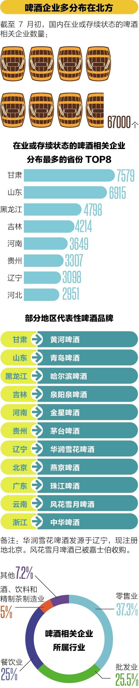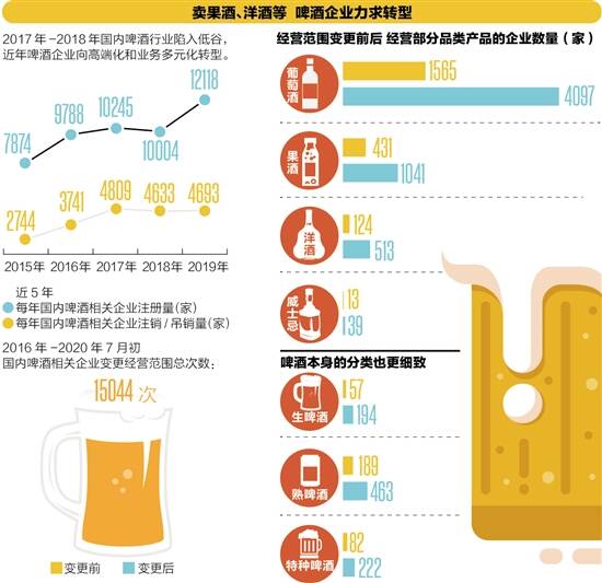 在2013年达到啤酒产量的高点后,啤酒行业也进入了新一轮的调整期。天眼查数据显示,自2017年起,国内啤酒相关企业注册量增长乏力,注销或吊销的企业数量显著上升。2018年,啤酒相关企业注册量更是同比下滑。相关变化表明,以低价促进销量主导的经营模式已不再适用。通过啤酒高端化提高啤酒单价、吸引有消费能力的人群成为啤酒企业发展的一个重要方向。 2011年-2018年,国内低档啤酒销量占比由61.6%下滑至35.5%,同期高档啤酒销量占比从11.2%上升至34.85%。资产整合则成为集中发力中高端啤酒或注入中高端啤酒品牌的重要一步。今年6月底,重庆啤酒宣布大股东嘉士伯将进一步将体系外控股的啤酒资产全部注入重庆啤酒。在嘉士伯注入的资产中,便包括嘉士伯、乐堡、凯旋1664等国际高端品牌。至此,包括华润雪花、青岛啤酒等在内的啤酒巨头基本完成了资产整合。 从国内市场看,百威目前的高档产品储备相对较丰富,产品包括科罗娜、福佳、百威铝罐等。较早进入高端啤酒市场的青岛啤酒拥有的高档产品包括IPA精酿、鸿运当头、奥古特、经典1903等。华润啤酒则拥有雪花脸谱、匠心酿造、喜力等。以上高档啤酒价位在10元左右,价格为低档啤酒的数倍。目前,中高档啤酒销量均占华润啤酒、青岛啤酒和百威啤酒总销量的四成以上。 高档啤酒产品中,精酿啤酒近年来得到了更多消费者的关注。与工业啤酒相比,精酿啤酒常使用上等原料,发酵时间长达两个月。制作而成的精酿啤酒麦芽浓度高,风味浓郁。川财证券研报显示,由于精酿啤酒在国内核心城市得到更多年轻人青睐,精酿啤酒厂商从2012年的7家增加至2018年的848家,而目前销量占比仅2.4%的精酿啤酒市场仍处于快速成长期。目前,代表性的精酿啤酒包括青岛啤酒的IPA精酿和经典1903等,百威还收购有精酿啤酒酒吧开巴和精酿啤酒餐吧拳击猫。 啤酒品牌加快转型 新增果酒、威士忌等业务 啤酒品牌的转型升级还包括引进多元业务。例如,燕京啤酒向矿泉水、饮料、生物制药领域扩展。青岛啤酒旗下则有苏打水、葡萄酒和威士忌业务。新快报记者据天眼查数据整理得到,2016年至今年7月初,国内啤酒相关企业共有变更经营范围1.5万次。而在有变更记录的企业中,变更前经营范围含白酒、葡萄酒、威士忌、果酒、洋酒、果汁业务的企业分别有4934家、1565家、13家、94家、124家和94家,变更后经营以上业务的企业分别增加了177.5%、161.8%、200%、141.5%、313.7%和166%,变更后经营内容普遍更加丰富。 近年来,随着女性啤酒消费者增加,多家啤酒企业还推出了果味啤酒。如今,市面上不只有经典的菠萝啤果味啤酒,还有草莓、水蜜桃、百香果及混合水果等多种口味的果味啤酒。果味啤酒也逐渐走向高端化,例如莱宝啤酒的黑色兔子系列和优布劳啤酒果味系列便是主打中高端市场的果酿啤酒。继推出西柚精酿啤酒后,泰山啤酒近日还推出了一款西柚味原浆啤酒,特别设计了方便女性拧开的啤酒盖。前瞻产业研究院《中国果味啤酒行业品牌竞争与消费需求投资预测分析报告》显示,去年国内果味啤酒消费量26.2万千升,预计2024年果味啤酒消费量将比2019年增长约六成。 ■数据来源:天眼查、桔子IT