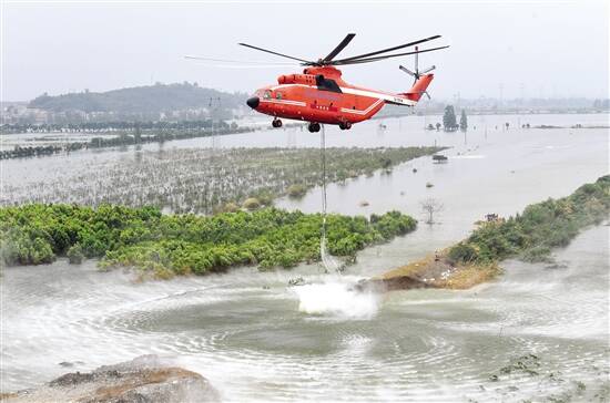 据新华社电 9日,湖北省阳新县富河干堤葵赛湖段下垸出现一处溃口。溃口处通往附近106国道的现有道路长约2公里,其中1公里为河堤,路面窄、路基软,大型机械设备和工程车辆无法抵达,抢险施工难度较大。16日,湖北省应急管理厅紧急调度3架直升机在溃口上空空投网兜石块。