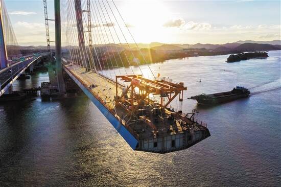 ■广东上半年经济稳步复苏为下半年持续恢复打下了坚实的基础。图为6月19日拍摄的广州南沙港铁路跨西江特大斜拉桥钢箱梁吊装和斜拉索施工现场。 新华社发 |