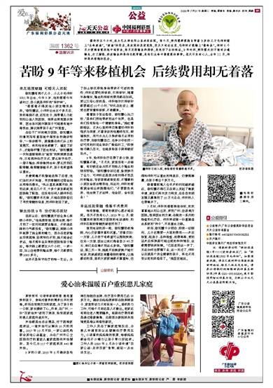 辗转四五个小时,坐大巴从清远阳山县来到东莞。每个月,欧阳霞都要独自带着9岁的儿子毛伟轩踏上“生命旅途”。“旅途”的终点,是东莞的某家医院,因为只有在这里,毛伟轩才能输上“救命血”。伟轩6个月大便确诊重刑地中海贫血,每月定期输血和排铁,是他活下去的保证。9年时间,欧阳霞夫妇不敢有分毫懈怠,打工赚钱、奔波输血和等待匹配骨髓,是他们生命中最重要的事情。苍天不负有心人,去年11月,伟轩等来移植的机会。 亲友驰援献髓 可惜无人匹配 欧阳霞有两个儿子,小儿子毛伟轩2011年出生,今年9岁,他的哥哥今年读初三,自小就是伟轩的“保护神”。 “哥哥看不得其他小朋友嘲笑弟弟。”欧阳霞说,小伟轩出生五个多月后,突然高烧不退,还拉肚子,她带着儿子赶到阳山县人民医院,结果血常规显示异常,医生当时就怀疑孩子可能患有地中海贫血,建议她带孩子去广州复查。 在位于广州的南方医院,欧阳霞夫妇拿到写有重型地中海贫血的确诊报告,“一纸诊断书,就像戴在我们头上的紧箍咒,我和他爸爸都蒙了,镇定了好久,才勉强听懂了医生的话。”欧阳霞第一次知道被简称为“地贫”的疾病源自遗传,只有两种治疗方式,要么保守治疗,一辈子输血、排铁维持生命;要么找到匹配骨髓,做骨髓移植手术,孩子有希望得以重生。 夫妻俩毫不犹豫地选择了后者,他们当时并不知道,寻找骨髓的过程会如此艰难而漫长。“先从直系亲属开始,再到近亲,前后几个月,十多个亲友都赶到医院做了配型,但没有任何人跟伟轩匹配。”欧阳霞束手无策,只能在医院登记了寻找骨髓的信息,把伟轩抱回了家。 输血排铁9年 治疗耗尽家财 自那以后,欧阳霞就开始全身心照顾小伟轩。“他体质很弱,经常生病,每个月到了一定时间就要去输血,不然连走路的力气都没有。”欧阳霞说,照顾小伟轩耗费了她全部的精力,因为在老家输血非常困难,经常预约不到,她只能舍近求远,每月搭车去东莞的医院给孩子输血。每次路上都要五六个小时,一来一回,加上住宿费和输血费,每个月都要花费2000多元。 这并不是保守治疗的唯一支出。为了防止铁沉积给身体带来不可逆的损伤,伟轩还要吃排铁药,打排铁针,随着年龄增长,输血和排铁的费用都在加码。更让父母心疼的是,伟轩每次打排铁针都要超过10个小时,“针扎在肚皮上,睡觉也要背着排铁泵,不敢翻身。” 看着孩子受这些苦,欧阳霞心如刀绞,“是我们把他带来到这个世界,也是我们没有给他一个健康的身体。”她红着眼眶说,丈夫心里同样交集着对伟轩的愧疚与深爱,不善言谈的他搬砖拉瓦、砌墙抹灰,用汗水为儿子挣来每月必须的治疗费,而欧阳霞自己,也争分夺秒找一切可用的时间去制衣厂做临时工,“即使每月赚几百元,也能多给孩子煲两顿好汤水。” 9年,给伟轩治疗花费了多少钱,欧阳霞算不清。“月月光,家里没有一点储蓄,有时候还会为找不到给儿子输血的钱而烦恼。”欧阳霞告诉记者,纵使拼尽了全力,可伟轩还是因为有时得不到及时的输血,导致面部逐渐变形,不懂事的小朋友会因此嘲笑他,而这时,伟轩的哥哥就会站出来提醒他们,“不要欺负我弟,他生病了才这样,他会好,会长回去!” 幸运找到骨髓 难筹手术费用 唯有移植,哥哥的美好心愿才能实现。苍天不负有心人,2019年11月,欧阳霞突然接到南方医院的电话通知:和伟轩匹配的骨髓贡献者找到了! 接到电话的那一晚,欧阳霞彻夜难眠,内心交织着欣喜和沉重。“悲喜交加!一方面,儿子终于有希望可以摆脱疾病;但另一方面,医生让我们准备至少40万元,我们实在筹不到这么多钱。”欧阳霞说,第二天一早,她就开始挨家挨户地打电话,和亲戚朋友商量借钱的事情。让她感动的是,虽然大家家境都不算富裕,但得知伟轩可以重生的消息后,仍慷慨解囊,为孩子凑出十多万元。 眼看着距离入仓手术的时间越来越近,欧阳霞不得已又在网上发起了筹款申请,亲友们再次发力转发,在各自的朋友圈又募集到了10万元左右,伟轩的入仓费筹齐了。 7月初,伟轩和哥哥拥抱告别,欢欢喜喜地从阳山出发,来到广州,住进南方医院。按照医生的方案,在做完一系列的检查和化疗后,伟轩将迎接一份重建造血系统的“种子”,开启重生之路。 然而,欧阳霞十分明白,即使一切顺利,儿子还需要一大笔的费用——术后恢复、租房子、各种检查、药费等等,更别说术后排异期可能出现的种种情况,这都需要钱来保障。“已经走到这一步了,无论如何也要撑下去,这一关过了,伟轩以后就是个完全健康的孩子,再也不用受以前的那些苦了。”她坚定地说。