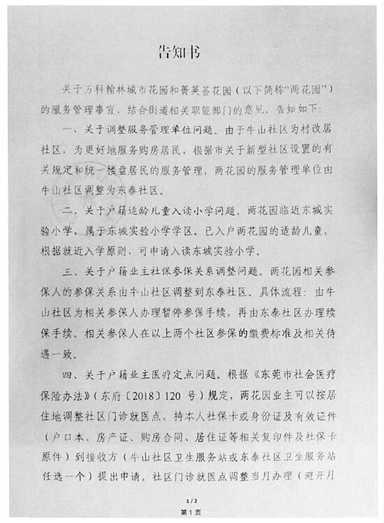 近日,翰林城市花园业主向新快报记者投诉反映,去年9月,牛山社区居委会发布《告知书》,称翰林城市花园、菁英荟花园纳入东泰社区管理,不再归属牛山社区。业主认为,该《告知书》令人不解,明明在家门口的牛山社区却拒绝为居民提供服务,要求居民跑到7公里外的东泰社区接受配套服务,“该行政行为超越了职权范围,而且没有进行公示,没有依照东莞市政府的相关意见,属于程序违法。” 在多次沟通未果后,4名业主将所在街道——东莞市东城街道办事处告上法庭,该案于7月15日在东莞市第一人民法院已开庭审理,法院将择期宣判。 ■ 新快报记者 何生廷 业主户籍所属地被更改 原社区不给办入户 “我之前办理入户牛山社区,却被告知要去更改。”翰林城市花园业主吴小姐告诉记者,她于2017年7月买了翰林城市花园的房产,2019年7月办理了房产证,也顺利办理了入户手续。 据悉,翰林城市花园、菁英荟花园由东莞市卓越天城房地产开发有限公司所开发,坐落东莞市东城区牛山钟屋围,均属东城街道牛山社区钟屋围旧村地块“三旧”改造的同一项目。 2017年10月12日,东莞市东城街道办事处出具过一份《关于翰林城市花园商住小区项目归属管理社区问题的回复函》,明确答复称翰林城市花园小区商住小区项目归属东莞市东城街道牛山社区管辖,由牛山社区做好该商住小区社会治安管理、户籍管理、计划生育管理和消防安全管理等工作。 吴小姐表示,入住后,业主陆续办理入户,截至2019年8月25日,翰林城市花园已入户牛山社区共497户,1232人。 可2019年8月25日后,翰林城市花园业主去牛山社区办理社保、户籍,却被工作人员告知要去7公里外的东泰社区办理。 2019年9月19日,牛山社区居委会正式发出《告知书》,内容称翰林城市花园、菁英荟花园纳入东泰社区管理,参保人的社保关系也随之调整。 “我们看中了这里的环境、就学等优势,才购买了这个小区的房产。”吴小姐说,在没有下达任何文件通知的情况下,竟然被悄悄划入了六七公里外的东泰社区,“小区在环城路外侧,与东泰社区天然隔绝,就医、小孩上学都很不方便。而且更改社区后,如何确保小孩能就近入学到旁边的小学?” 业主申请信息公开 被告知“信息不存在” 考虑到多方面的不方便,业主多次到牛山社区反映诉求,向相关部门递交了《关于恢复翰林城市花园、菁英荟花园原归属管理社区的诉求申请书》,请求恢复由牛山社区管理。 在诉求书上,业主提到,在沟通过程中,牛山社区党工委书记刘伟华回复业主,因牛山社区缺乏花园小区的管理经验和相关专业工作人员,管理压力和管理成本非常繁重,才向东城街道申请变更归属管理社区。业主对该回复表示不满,认为牛山社区推卸社会责任,忽视3000多户人的权益。 根据东城街道办事处于2018年8月印发的《东城街道商住小区项目归属管理暂行办法》,提到对过往已明确归属管理的商住小区项目不作调整,仅对本办法印发后新增的商住小区项目归属管理问题予以明确。 该管理办法还提到,项目所在地块通过集体自行改造、村企合作“三旧”改造等方式协议出让获得土地使用权开发的,隶属原土地所有方社区居委会管理。 对此,多名业主表示,翰林城市花园、菁英荟花园均属于牛山社区钟屋围旧村地块“三旧”改造项目,为何要突然更改所属社区呢,业主表示不理解。 此外,根据东莞市人民政府办公室印发的《东莞市村(社区)规模调整工作指导意见》,社区调整方案要经村民会议表决统一后,各镇街要及时报请市政府批准。 然而,当业主向东莞市人民政府申请信息公开,要求公开“对东城街道牛山社区居委会进行规模调整的决定,将翰林城市花园、菁英荟花园所属社区由牛山社区调整为东泰社区的决定”,最终得到的答复是所申请的信息不存在。业主表示,这意味着该调整并未报请市政府。 业主提起行政诉讼 将街道办告上法庭 在沟通未果之后,许女士等几名业主决定提起行政诉讼,将东城街道办事处告上法庭,东城街道办事处牛山社区居民委员会列为第三人,认为被告作出涉案行政行为违法,且不具备合理性,应当予以撤销。 原告认为,在申请信息公开之后,发现东城街道办未将涉案社区规模调整方案报请东莞市人民政府批准,属超越职权的违法行为。 此外,东城街道办作出涉案行政行为未进行公示,也未依照上级人民政府所颁发的相关意见,征求社区内居民意见、进行民主表决程序、召开听证程序等,涉案行政行为违反上级人民政府颁发的指导意见、《东莞市重大行政决策听证试行办法》等相关法律法规之规定,属于程序严重违法。 业主表示,本案中,被告作出的社区规模调整决定直接导致包含原告在内的涉案社区居民在医疗、教育、交通、社会保障等方面遭受重大影响。如教育方面,在社区规模未调整前,翰林城市花园、菁英荟花园业主享有“东城实验小学”的学位,而调整之后,导致该学位相应也可能改变;医疗方面,调整后,社区居民想要到社保定点医疗机构就医就需去到6公里以外的医院,加大了成本。 街道办:不属可诉行政行为 请求法院驳回 律师称:符合行政行为特征 更改并无依据 在庭审中,东城街道办辩称,牛山社区居委会作出的《告知书》是居民实施自我管理、自我服务的行为,不属于具体行政行为。 东城街道办表示,街道办应牛山社区请示作出的《关于