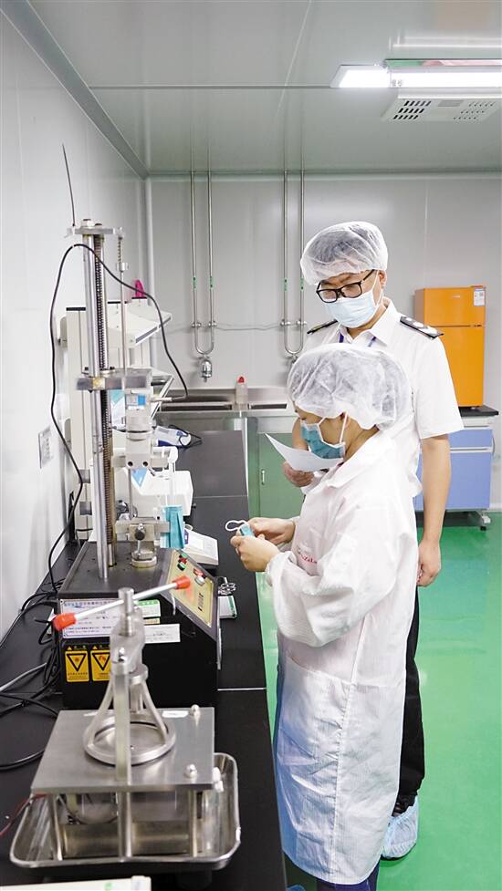 原材料仓库、生产车间、包装间……地毯式全面检查 笔者跟随省药监局医疗器械监管处一级主任科员张扬来到广州福泽龙卫生材料有限责任公司的生产车间,此次突击检查按照口罩生产的流程,依次对原材料仓库、生产车间、包装间都进行了检查。 张扬向笔者介绍,由于医用口罩生产过程主要为物理加工过程,所以原材料的质量对成品最终质量起到关键作用。生产企业要对采购的原材料的过滤效率、通气阻力、生物相容性、耳带拉力等关键指标进行控制。同时,医疗器械法规也有对原材料的仓储条件、记录信息、分类储存等方面规定,“例如在仓库管理上要做到防潮、防鼠、防蚊虫,注意控制仓库的温湿度。按规定,温度不应超过40℃,湿度不超过80%。当前该仓库的温度为32℃,湿度为65%,符合标准。” “在生产车间,我们主要关注‘人、机、料、法、环’五个环节。”张扬详细解释,按照法规要求,无菌的医用口罩应在10万级洁净厂房内生产,操作人员是否熟悉工序、生产设备是否正常运作、原材料能否溯源、每一个步骤是否按照SOP(标准操作程序)进行、环境是否符合洁净要求等,都是检查人员关注的重点。口罩生产出来后,企业还应对每一批次的成品进行抽样检测,主要包括外观、耳带拉力、通气阻力等性能检测,无菌医用口罩还要检测无菌、环氧乙烷残留量。 包装环节也不容忽视,张扬表示,在产品的最小销售包装上,必须要有医疗器械注册证号、医疗器械生产许可证号、生产日期、有效期等信息,消费者选购口罩时可以通过这些信息,来验证产品的合法性。 “我们公司从事防疫用品生产逾20年,疫情前主要经营出口业务,口罩月产能约800万个,现在月产能大幅提升至4000万—5000万个,增长超过4倍。”广州福泽龙卫生材料有限责任公司总经理周月华向笔者介绍,疫情发生后,为满足国内市场需求,公司所有产品转为内销,优先保证国内的防疫物资供应,自4月开始才逐渐恢复出口业务。她告诉记者,疫情期间,广东省药监局为企业提供了很多帮助,包括向他们解读取得资质绿色通道等政策,还提供上门检测服务,大大加速了企业的生产效率。 医用口罩企业增加近19倍至513家,检查100%全覆盖 “从检查结果看,经过前一阶段对防疫医疗物资重点生产企业100%全覆盖检查,目前大部分医用口罩生产状况总体良好。”据广东省药监局医疗器械监管处处长张锋介绍,新冠肺炎疫情发生后,广东省高度重视疫情防控医疗物资“保供应”工作,通过开设应急审批通道、定点驻厂指导等方式支持符合条件的企业转产、扩产医用口罩,迅速提高口罩供应量。截至2020年3月12日,广东医用口罩生产企业从疫情前的26家增加至513家,增幅近19倍,产能由146万个上涨至4412.12万个。 张锋介绍,面对全省生产企业数量暴增的形势,广东省药监局通过远程指导、现场帮扶等多种手段,指导企业改造生产车间,确保产品原材料采购渠道畅通、产品质量合格稳定。同时,督促企业整改缺陷问题,承诺保证医疗器械生产质量管理规范体系有效运行。此外,强化投诉举报处置,对涉及药械类的 投诉举报急件,予以“加急”办结,保持对防疫用医疗器械高压态势以及对其违法行为的“零容忍”。 在保证国内供应的前提下,广东也支持和推动符合条件的医疗器械企业出口。张锋表示,广东省药监局配合省商务厅审核医疗物资出口清单,鼓励有条件、有资质的企业出口,禁止违法违规、产品质量不合格的企业出口。“到目前,广东省疫情防控医疗器械产品的质量得到有力保障,尚未有因产品质量问题而遭到退货或出不了关的情况,有产品被禁止出口或遭到退款都是因为公司行为违法违规或不熟悉国外法规所导致。”张锋说。 生产环节后,医用口罩上市流通前还要“过五关” 生产环节之后,医用口罩流通到市面前,还必须经过广东省医疗器械质量监督检验所医用材料检验室的“五大关”,以确保质量安全。 笔者跟随广东省药品监督管理局组织检查人员走进了广东省医疗器械质量监督检验所。该所医用材料检验室是全国主要防护产品试验室之一,承担医用防护口罩、防护服产品的检测和标准验证工作。今年疫情期间,该检验室截止目前共完成医用防护口罩、医用外科口罩、一次性使用医用口罩的注册检验任务绿色通道2000批次,立案打假任务100批次,市场监督抽验任务300批次,商品进出口检验任务200批次,医用防护服检验任务 300批次,检验技术和检验任务量位居全国前列。 据广东省医疗器械质量监督检验所医用材料检验室主任、高级工程师黄敏菊介绍,医用口罩测试包括口罩带断裂强力检测、过滤率测试、密合性能测试、防水测试、阻隔血液性能测试等五大关。 小小一根口罩带,会不会很容易断裂?笔者现场看到,工作人员对口罩带检测时,要求每根口罩带与口罩体连接点的断裂强力应不小于10N,测试时每次要持续5秒。“如果5秒内断了,口罩带则不合格”。 口罩密闭性直接关系到口罩的保护作用,在这项测试中,工作人员要戴上医用防护口罩,进入一间充满了氯化钠气溶胶的小房间,做左右摇摆、 上下点头等共6个动作,测试口罩是否漏气,一个工作人员完成需要10分钟。一个抽检的口罩需要十个工作人员测试,分别是5男5女,不同的脸型,通过数据显示来测试口罩的密合性。 在防水测试中,工作人员注入250毫升水往口罩滴漏,全部