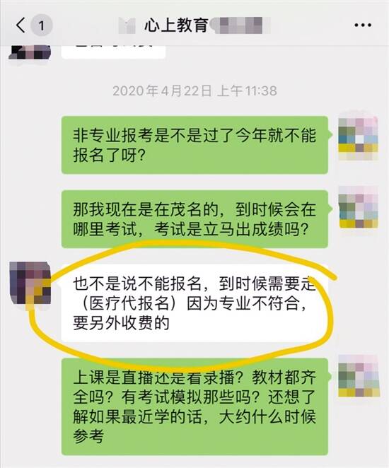 朱小姐在一家名为“心上教育”的教育培训公司报名了健康管理师培训考证,交学费时被告知符合考证要求,报名时才知要有工作经验才能报考。培训机构想要她作假,她不愿意,最后报不了名。她认为是培训机构在其交学费前对考证条件有所隐瞒才导致的,所以希望能全额退款,而对方一再表示只能退500元。记者在进一步调查中发现,工作证明可造假已成为多家健康管理师培训机构告知学员的规则,有的甚至直接说可帮忙代办。 ■新快报记者 肖韵蕙 学员投诉 交学费时称“符合报考条件” 报考时却被要求交工作证明 朱小姐表示,今年4月,她在网上看到了报考健康管理师的小视频广告,称考过之后就可以领取相关补贴,随后在视频下面看到有人评论,说自己已经考过了。与这位网友取得联系后,对方向朱小姐推荐了自己的培训机构“心上教育”。随后朱小姐加了“心上教育”工作人员的微信。 在朱小姐提供的与工作人员微信聊天的截图中,朱小姐问:“专业会计、大专函授毕业、本科函授在读符合要求吗?”对方回答:“学历是符合要求的,也不是说不能报名,因为专业不符合需要另外收费。”朱小姐表示,当时因为得到了“可以报名”的肯定的答复,便没有再细问。再加上对方给她发了公司的营业执照等,所以朱小姐便报名学习,并交了1980元的学费。 今年7月,到了要报名考证的时候,朱小姐在提交报名资料时却发现需要工作证明,可自己一直从事会计工作,并没有医药卫生相关的工作经验。 朱小姐随后询问“心上教育”的一位负责人,对方却称要她“找找看有没有开药店诊所的亲朋好友去开一个工作证明。”“这不是作假吗?”而朱小姐并不愿意作假,并且想退款。 央视3·15晚会曾指出,嗨学网销售在学员交钱时会做出“100%包过”等各种承诺,后又履行不了。其售后经理承认是销售的失误,但后续退款仍然艰难。而朱小姐表示,在了解到自己不愿意作假之后,一位名为“心上教育-教务张主任”并不承认之前他们的工作人员有跟朱小姐提过“符合报考条件”之类的话。 朱小姐称,她与心上教育是没有签合同的。后来她多次找到心上教育要求退款,并认为因为是对方的欺骗行为自己才交费报名,所以应该退全款1980元,而对方只愿意退500元。 新快报记者在中国卫生人才网上查询到,根据《2020年卫生健康行业职业技能全国统一鉴定工作报告》,报考健康管理师三级应具备的条件是:“具有非医药卫生专业大学专科以上学历证书,连续从事本职业或相关职业工作两年以上,经三级健康管理师正规培训达规定标准学时数,并取得结业证书。”而此规定是2019年12月20日由国家卫生健康委人才交流服务中心发布,为朱小姐2020年4月在心上教育报名之前。 朱小姐称,目前她已拨打“心上教育”所在地北京市的12345热线投诉,目前相关部门已受理,正在处理中。 记者调查 机构广告称考健康管理师“不限专业” 有培训机构直言“可代开工作证明” “政策扶持、前景广阔,考过可领国家几千元补贴”。这是记者在某视频APP看到的关于健康管理师证书的多个培训机构发布的广告。关于该证书的报考条件,有培训机构在短视频里宣传“不限专业”。在这些视频广告下,和之前朱小姐提及的一样,有多位用户评论“求靠谱的培训机构”,并有人开始在下面回复。 新快报记者在网上搜索“健康管理师”词条,出来了多家培训机构的咨询入口。在回答“报考要什么条件”的问题时,一家机构表示“根据是否医药卫生专业而定,最低初中及初中以上学历就可以。”其他并未细说。另一家机构回复“不限制专业,都可以报名”。并称“现在国家没有开放个人端口不允许个人报名,报名都是机构统一报”。在回复“没有从事这方面工作”的问题时,该机构工作人员称,“相关工作证明,咱们这边给你报名的时候也会给你代开的”。后来对方还称“结业证书和工作证明机构都可以代开”。 该机构工作人员还表示,到时会帮忙在报考当地找一个单位在工作证明上盖章,到时也不会被查,因为“工作证明不是硬性条件,只会审核学历证这一块。”还说“之前已经报名好几期了,从来没有出现过一个有问题的,现在都已经通过考试拿到证书了。” 商家答复 只能退500元报名费用 可以继续提供教学服务 7月23日上午,新快报记者拨打朱小姐提供的北京心上教育咨询有限公司的电话,无人接听。后记者又拨打该公司在“天眼查”上留下的手机号码,也并未接通。随后记者发短信说明了采访请求,截至发稿前并未得到回复。 在此前心上教育工作人员回复给朱小姐的对话截图中,显示对方称“我们可以退还您500元的报名费用,您的课程还有教学服务我们可以继续为您服务”。 此外,据朱小姐表示,她都是在微信上和心上教育的工作人员联系的,从没有登录过他们的官方网站,而之前上网课也是在一个名为“学习网”的网站上。“天眼查”显示,“北京心上教育咨询有限公司”成立于2017年,经营范围为经济贸易咨询、会议服务、教育咨询(中介服务除外)等等。“天眼查”也未显示该公司的官方网站。 律师说法 若没告知报考条件 培训机构应退全款 广东保典律师事务所合伙人,公益律师廖建勋对新快报记者表示,培训机构在没有告知消费者真实报考条件的情况下,导致消费者不能完成相应的报考工作,并导致合同不能履行,责