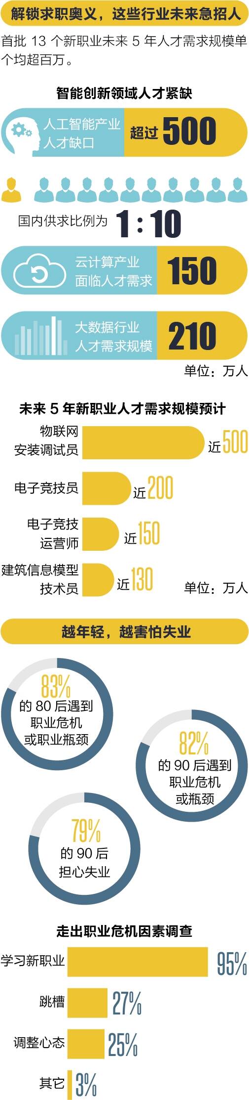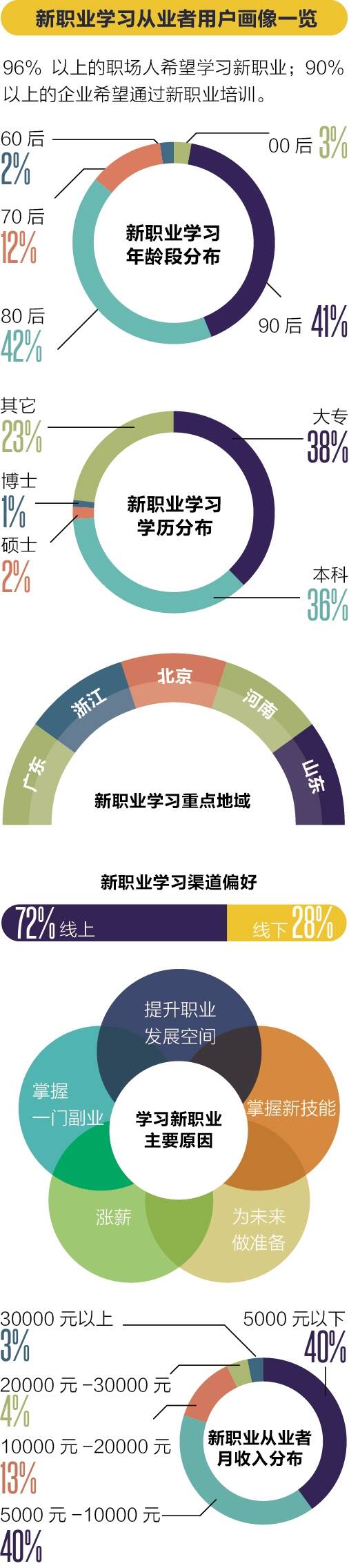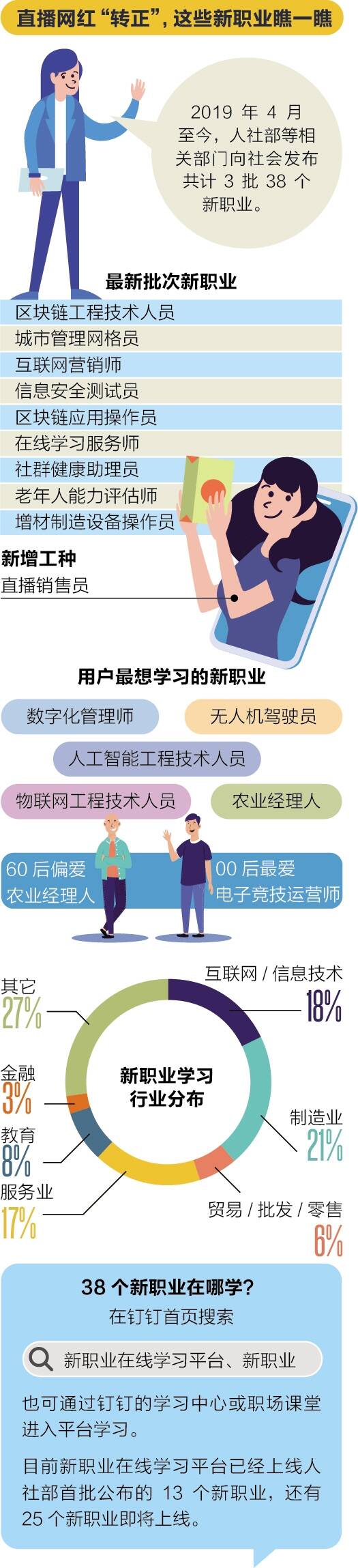 与此同时,新职业学习从业者热情高涨,96%以上的职场人希望学习新职业,80后和90后成为新职业的主力军。新职业中,“数字化管理师”“农业经理人”“电子竞技运营师”等职业颇受关注,市场需求旺盛。此外,“互联网营销师”职业下增设“直播销售员”工种,电商主播、直播网红也由此“转正”。目前,在钉钉搜索“新职业”,或进入钉钉学习中心,即可在线学习人社部正式公布的首批13个新职业。 ■策划:新快报记者 罗韵 ■统筹:新快报记者 罗韵 ■采写:新快报记者 张磊 ■制图:廖木兴 智能创新领域人才紧缺 新职业市场前景广阔 近年来,人工智能、物联网、大数据等领域发展步入快车道,成为国家重供给侧改革的创新引擎,孵化出的新业态新职业正充当着经济“风向标”的角色。而在今年,疫情冲击下的就业形势更加复杂严峻,在餐饮、旅游等服务业一度按下“暂停键”的同时,“宅经济”“云经济”等新业态表现亮眼,成为维持上半年消费活力的关键力量。 与此同时,智能创新领域方面的人才缺口也在不断扩大。根据阿里钉钉和人社部中国就业培训技术指导中心联合发布的《新职业在线学习平台发展报告》(以下简称《报告》),我国人工智能人才目前缺口超过500万,云计算产业面临150万人才需求,国内供求比例为1:10的严重失衡状态。如果不加强人才培养,到2025年人才缺口将突破1000万。由此看来,新职业、新业态已经成为吸纳就业的重要蓄水池。 工业和信息化部教育与考试中心主任马蔷表示,积极适应相关行业的发展现状,尽快解决日益凸显的人才供需矛盾,是推动行业发展的当务之急。 围绕人才稀缺问题,国家政府层面一直释放出利好信号,连续发布新职业政策刺激就业。数据显示,仅从2019年4月至今,人社部等多部门就正式向社会发布共计3批38个新职业。而在近期发布的两批新职业中,新兴产业和现代服务业成为“主要战场”,互联网营销师、区块链应用操作员、在线学习服务师、社群健康助理员、老年人能力评估师等工作备受关注。 新增职业之外,新增工种也随之出现。在“互联网营销师”这一热门职业下,就增设了“直播销售员”这一工种。这也意味着,“电商主播”“带货网红”等网络用语也变成了正式的职业称谓。 稳就业保就业,新职业在线学习平台应运而生 加快培育一批吸纳就业能力强的数字经济产业,将会催生更多的经济和就业新增长点。在这一背景下,新职业在线学习平台应运而生。6月8日,人社部中国就业培训技术指导中心和阿里钉钉联合推出新职业在线学习平台。据了解,该平台是全国首家专注于新职业数字资源培训的线上服务平台,立足培育新型技能人才,服务促就业稳就业,今年计划培训100万新职业从业者。 目前,新职业在线学习平台已完成首批数字化管理师、人工智能工程技术人员、电子竞技运营师、农业经理人等13个新职业在线培训资源上线工作,相关人员可以在平台线上学习、培训、考试,并获得电子培训证书。第二批供应链管理师、网约配送员、人工智能训练师、全媒体运营师、健康照护师等16个新职业也正在启动培训资源上线准备工作。 新职业在线学习平台的出现,为国民持续不断终身学习需求,以及劳动者技能的提升和转换提供了平台和载体。对于新职业在线学习平台的推出,阿里钉钉副总裁任卿表示,钉钉把支持和推进国家数字化人才培养作为重要平台责任,致力于打造面向数字化未来的年轻人成长平台,为促进数字经济高质量发展和转型升级提供技能人才支撑。 中国就业培训技术指导中心主任刘康表示,新职业在线学习平台的正式推出,将进一步引导更多社会公众了解新职业、学习新职业和从事新职业,提升新职业从业人员整体技能水平,快速形成新职业人才培养的专业化、规模化效应,满足产业升级转型过程中的新型技能人才需求,进一步服务稳就业、保就业。 80后90后成主力军,广东用户最爱学习新职业 自6月8日新职业在线学习平台正式上线以来,新职业从业者在线学习热情高涨。《报告》显示,96%以上的职场人希望学习新职业。其中,提升职业发展空间、掌握新技能、为未来做准备成为职场人士学习新职业的主要原因。另外,90%以上的企业组织希望通过新职业培训,提升员工成长空间,给企业注入新动力。 在年龄维度层面,80后和90后是新职业的主力军,整体占比超过80%,在薪资水平上,新职业从业者中的60%以上收入超过5000元,其中3%的新职业从业者人均收入达到了3万元以上。此外,新职业从业者的整体学历偏高,专科、本科及以上学历从业者人数占比达到77%。由此可见,新职业优化了产业结构,年轻群体更意愿选择新职业就业。 在地域分布上,《报告》显示,广东、浙江、北京、河南、山东、陕西、江苏、上海等地学习新职业人数最多。业内专家分析认为,新职业为城市发展注入新动能,催生越来越多“新就业城市”。 担心失业是用户选择学习新职业的主要原因。数据显示,80%以上的80后和90后都遇到职业危机或职业瓶颈,其中90后成为最担心失业的群体,担心失业的人群比例达到79%。在学习方式上,移动在线学习成为市场主流,72%的用户选择线上学习新职业,理由是学习的时间和空间成本相对更低。此外,95%的用户认为,学习新职业、提升自身发展潜力是走出职业危机的关键因素。 市场需求高,“数字化管