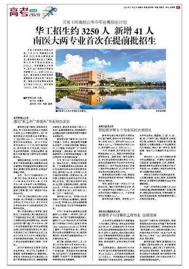 华工招生约3250人 新增41人 南医大两专业首次在提前批招生