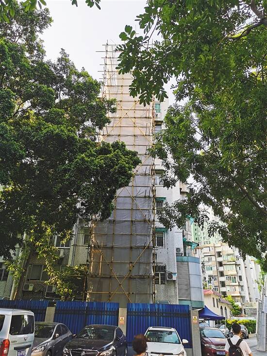 ■广州市天河区天河东路一小区,一栋居民楼电梯加装项目正在施工中。 新快报记者 朱清海/摄 |