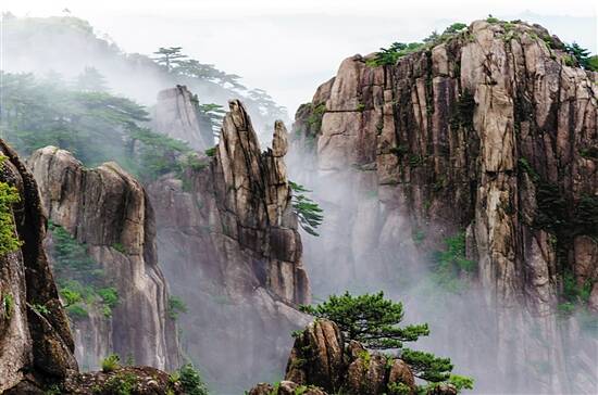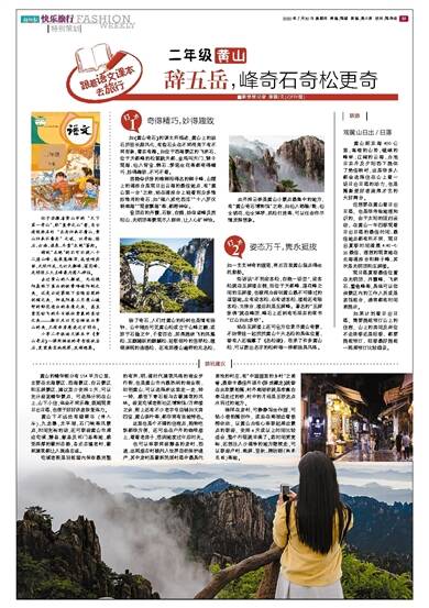 位于安徽省黄山市的“天下第一奇山”,取“皇帝之山”意,自古有经典名句“五岳归来不看山,黄山归来不看岳”之说,以奇松、怪石、云海、温泉、冬雪“五绝”著称。 铸就“五绝”的不可不提八十二座山峰,或崔嵬雄浑,或峻峭秀丽,天然巧成,尤以天都峰、莲花峰、光明顶三大主峰最为惹人神往。 去过黄山的人都说,无论艳阳高照下显出的铁骨峥嵘阳刚之美,还是云遮雾绕下若隐若现的妩媚之美,抑或阳春三月漫山遍野的鲜花透出的浪漫之美,甚至雪花纷飞的冬日银妆素裹的圣洁之美——都不足以完全描述出黄山的美,只有亲身感受过才明白。 小学二年级语文课本中《黄山奇石》一课所描述的奇形怪状岩石,更需要实地观察,发挥想象。 卡 1 奇得精巧,妙得趣致 如《黄山奇石》的课文所描述,黄山上的岩石历经长期风化,有些石头在不同视角下有不同形象,着实有趣。如位于西海景区的飞来石、位于天都峰的松鼠跳天都、金鸡叫天门、猴子观海、仙人背宝、醉石、梦笔生花等都奇得精巧,妙得趣致,不可不看。 因酷似伏卧的雄狮而得名的狮子峰,山腰上的清凉台是观日出云海的最佳地点,有“黄山第一台”之称,站在清凉台上能看到众多惟妙惟肖的奇石,如“猪八戒吃西瓜”“十八罗汉朝南海”“观音飘海”等,都颇神似。 登顶后的丹霞、石鼓、白鹅、始信诸峰及贡阳山、光明顶等景观尽入眼帘,让人心旷神怡。 此外排云亭是黄山小景点最集中的地方,有“黄山奇石博物馆”之称,如仙人晒鞋/靴、仙女绣花、仙女弹琴、武松打虎等,可以任由你尽情发挥想象。 打卡 2 姿态万千,隽永挺拔 除了奇石,人们对黄山的松树也是情有独钟,山中随处可见黄山松或立于山峰之巅,或挤于石缝之中,千姿百态,那展翅欲飞的凤凰松、玉麒腾跃的麒麟松、轻歌低吟的竖琴松、缠绵亲昵的连理松,还有那漫山遍野的无名松,如一支支神奇的画笔,将五百里黄山装点得生机勃勃。 俗话说“不到迎客松,白跑一场空”,迎客松就在玉屏楼左侧,而位于天都峰、莲花峰之间的玉屏楼,也被视为游玩黄山最不可错过的逗留地。左有迎客松,右有送客松,楼前还有陪客松、文殊台,楼后则是玉屏峰。著名的“玉屏卧佛”就在峰顶,峰石上还刻有毛泽东的草书“江山如此多娇”。 站在玉屏楼上还可全方位赏尽黄山奇景,不妨带娃一起找找黄山十大名松的具体位置,曾有人还编篡了《名松谱》,收录了许多黄山松,可以数出名字的松树每一株都独具风格。 观黄山日出/日落 联游 黄山距东海400公里,高峻的山势,嵯峨的峰林,辽阔的云海,为旭日东升及夕阳西下提供了绝佳映衬,这是很多人都会选择住在山上看一场日出日落的动力,也是摄影爱好者施展才艺的大好舞台。 但想要在黄山看日出日落,也是很考验地理知识的,由于太阳的回归运动,在黄山一年四季观看日出日落的最佳时间、最佳地点都有所不同,观日出夏季时间清晨4:40-5:20最佳,理想的观赏地在北海清凉台和狮子峰,其次是光明顶和玉屏楼。 观日落夏季最佳位置在光明顶、丹霞峰、飞来石、鳌鱼峰等,具体可以咨询景区内的工作人员或是宾馆前台,通常都有时间表提示。 如果计划看日出日落,需要提前预订山上的住宿,山上的房间及床位不论淡季还是旺季,都要提前预订,旺季最好提前一两周预订比较稳妥。 游玩建议 黄山的精华部分有154平方公里,主要在北海景区、西海景区、白云景区和玉屏景区,建议至少安排2天,可以充分游览精华景点,可选择分别在山上、山下小住,体会不同乐趣,既能观赏日出日落,也便于好好休息恢复体力。 黄山下不远处有翡翠谷(情人谷)、九龙瀑、太平湖、石门峡等风景点,时间充裕的话,还可联游黄山市周边屯溪、黟县、歙县及祁门县等地,感受深厚的徽州古韵,各式古镇老村、徽派建筑都让人流连忘返。 屯溪老街是目前国内保存最完整的有宋、明、清时代建筑风格的商业步行街,也是黄山市内最热闹的商业街,初到黄山,可以选择来这里走一走,转一转,感受下青石板与古徽建筑的风味。游览屯溪老街社区博物馆/万粹楼之余,街上还有不少老字号店铺如文房四宝、黄山茶叶等,都非常有当地特色。 这里也是个不错的住宿点,购物吃饭都很方便,还可坐在户外的咖啡座上,看看老房子,悠闲地度过午后时光。 也可以串联同游黟县的宏村、西递,这两座古村被列入世界自然保护遗产,其中宏村是徽派民居村落中最具代表性的村庄,有“中国画里的乡村”之美誉。奥斯卡最佳外语片《卧虎藏龙》就曾在此取景拍摄,村外南湖桥就是李慕白牵马走过的桥,村中的月沼是玉娇龙点水而过的地方。 徜徉在宏村,可静静写生作画,可钻小巷拍摄创作,或坐在南湖边看垂柳依依,以黄山为核心串联起周边景点的联游,安排4天或以上时间比较适合,整个行程就丰满了。若时间更宽裕,还想往人少清净的地方继续走,可以联游卢村、南屏、呈坎、牌坊群(鲍家花园)等地。