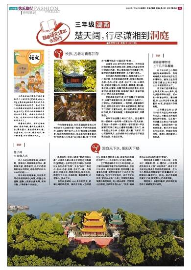 三年级的语文课本中有两首脍炙人口的诗词《望洞庭》和《山行》,《望洞庭》描述的是秋夜月光下洞庭湖的优美景色,表达了诗人刘禹锡对洞庭风光的喜爱和赞美;《山行》是诗人杜牧描绘秋日行山所见景色,唱诵大自然秋色之美,也因此让长沙岳麓山爱晚亭闻名天下。 跟着语文课本,将目光转向湖南,登岳阳楼,看洞庭波涌连天雪;攀岳麓山,感受爱晚亭之魅;岳麓书院、天心阁、橘子洲头,湘江翻涌着,行尽潇湘到洞庭。 打卡1 长沙,古老与青春并存 作为湖南省省会,长沙是国务院首批公布的历史文化名城和第一批对外开放的旅游城市,这里有“霜叶红于二月花”的岳麓山和爱晚亭,有水洲相拥的湘江,有在海内外享有盛名的“世界第八大奇迹”马王堆汉墓,有“千年学府”岳麓书院及“三国东吴”简牍…… 这座有2000多年历史的城市,同时也是时尚动感之都和美食之城,湖南卫视超女快男引领娱乐风潮,街头巷尾随处可见飘香小吃,探寻历史或感受青春奔放,长沙都不逊色。 长沙湘江西岸的岳麓山,是南岳衡山七十二峰之尾,自古就是著名胜景。岳麓山集名院、名亭、名寺、名宫、名泉、名木于一体,从清风峡、爱晚亭到麓山寺、白鹤泉、蔡锷墓、黄兴墓、禹王碑、云麓宫、岳麓书院等近百处景点,处处皆可说,道道有故典,秋季枫叶流丹,层林尽染时分,更让此处倍受青睐。 爱晚亭原名红叶亭,位于岳麓山下清风峡中,始建于清乾隆年间,是中国四大名亭之一,三面环山,四周皆枫林,一到深秋,周遭被枫叶染红,故取杜牧诗句“停车坐爱枫林晚,霜叶红于二月花”之意而命名。亭子古朴典雅,亭内金柱丹漆,四个翼角高翘,上覆绿色琉璃瓦,风景绝佳。 游玩可由岳麓山南大门进入,经岳麓书院—爱晚亭—舍利塔—古麓山寺—观光长廊、古炮台—鸟语林—云麓宫—穿石坡湖—辛亥援鄂汉阳阵亡将士公墓等到岳麓山东大门,途中会经过半山亭、白鹤泉、黄兴墓、飞来石、印心石屋等景点,这条线路的设计妙处在于游览景点全面,不走回头路。 打 卡2 洞庭天下水,岳阳天下楼 提到岳阳,很多人都有“熟悉的陌生感”,这是因为都从课本中学到过刘禹锡的《望洞庭》,也学到过范仲淹的《岳阳楼记》,岳阳古称“巴陵”,又名“岳州”,集名山、名水、名楼、名港、名文于一体。巴陵盛世,乃湘之北、洞庭之畔也;信步岳阳,洞庭天下水也;北通巫峡,南极潇湘,迁客骚人,多会于此。 岳阳这座城有2500多年的历史,波澜壮阔的洞庭湖,流传千古的《岳阳楼记》,秀美浪漫的君山岛,屈原投江殉国的汨罗江……无不吸引人们前往探寻。 立于洞庭湖畔千年之久的岳阳楼,从三国时始建阅军楼开始传承到现在,历经1700多年,其间多次被毁,到宋朝滕子京重修岳阳楼,请范仲淹写下千古名文《岳阳楼记》,“先天下之忧而忧,后天下之乐而乐”更成为众多仁人志士忧国忧民高尚情操的典范标杆。后人据此成联:“四面湖山归眼底,万家忧乐到心头”,“忧乐”精神便也从此成为岳阳楼的“灵魂”。 洞庭湖是我国第二大淡水湖,北接长江,南接湘、资、元、澧四水,八百里洞庭的真实含义是“神仙洞府”,语言文字无法完全描述及形容洞庭湖的美,古今文人墨客在洞庭湖留下的美豔诗文,不断被后人拿来评比,犹如一场不见硝烟的美文之战,延续至今,仍未有消散。 洞庭湖上,坐船听橹声,或许洞庭的悠然之美感悟更加透彻。 屈子祠 生当做人杰 联游 后人为纪念屈原修建,战国时期,爱国诗人屈原被流放至此,感救国无望,理想破灭,但又不愿屈服的他以死明志,选择汨罗江作为生命的归宿…… 屈子祠中有屈原像,传说是司马迁根据屈原的《离骚》而画出的画像,画像上屈原头戴高帽,表情忧幽,人物形象十分生动。 湖南省博物馆 上下几千年看遍 联游 位于长沙烈士公园西侧的湖南省博物馆,是湖南省最大的综合性历史艺术博物馆,镇馆之宝是马王堆汉墓出土的文物及2100年前的西汉女尸。 马王堆三座汉墓共出土珍贵文物3000多件,绝大多数都保存完好,其中有一件素纱样衣,薄如蝉翼,长1.28米且有长袖,重量仅49克,织造技巧非常高超。 三号墓出土的10多万字的帛书及已失传的佚书以及二号墓出土的地形图均评价极高,马王堆一号汉墓出土的女尸形体保存完整,全身还保持一定的润泽度,部分关节甚至还可以活动,软组织尚有弹性,堪称人类防腐学上的奇迹。