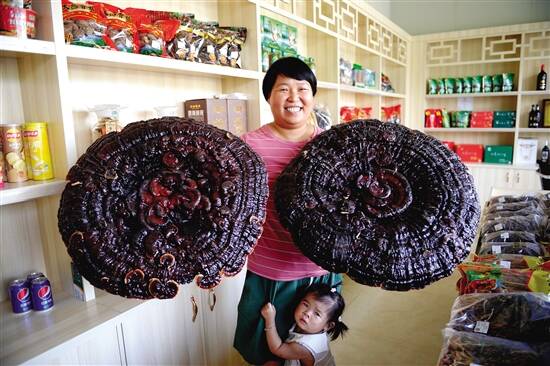 ■溪山镇东罗村建有电商平台,线上线下销售附近农户和源丰公司的农副产品。图为店里销售的大灵芝。 |
