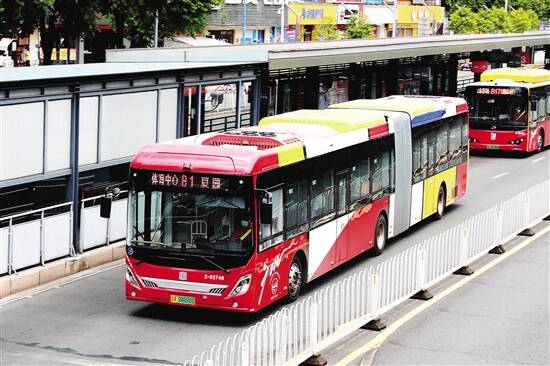 ■昨日,身披“七巧板”外衣的18米纯电动公交车在广州中山大道BRT正式投入运营,目前BRT系统已有超九成公交车为纯电动车。新快报记者 毕志毅/摄 |