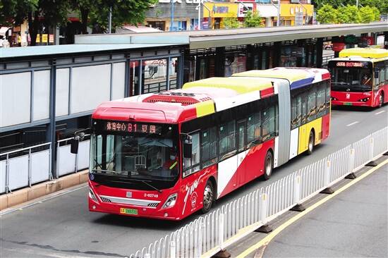 ■7月30日,身披“七巧板”外衣的18米纯电动公交车在中山大道BRT试验线正式投入运营。 新快报记者 毕志毅/摄 |
