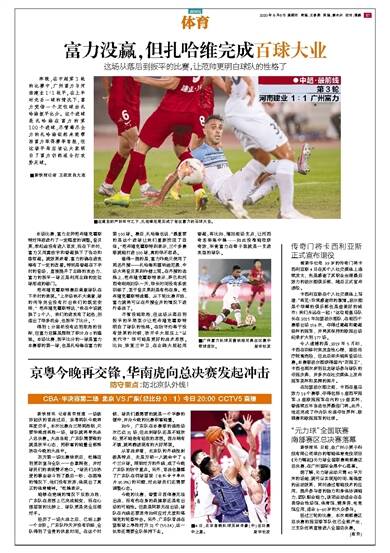 昨晚,在中超第3轮的比赛中,广州富力与河南建业1∶1战平。在上半时先丢一球的情况下,富力凭借一个定位球由扎哈维扳平比分。这个进球是扎哈维在富力的第100个进球,尽管竭尽全力的扎哈维依然未能帮助富力